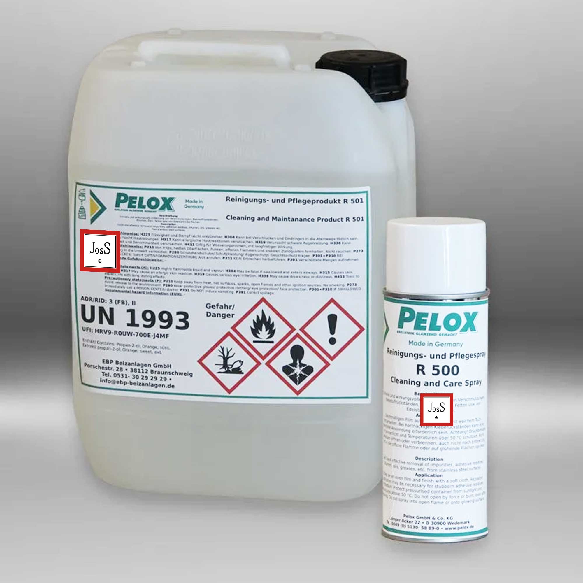 PELOX Cleaning and Maintenance Product R 500 is a high-strength aerosol cleaner and adhesive remover designed for residue-free treatment of stainless steel surfaces.
