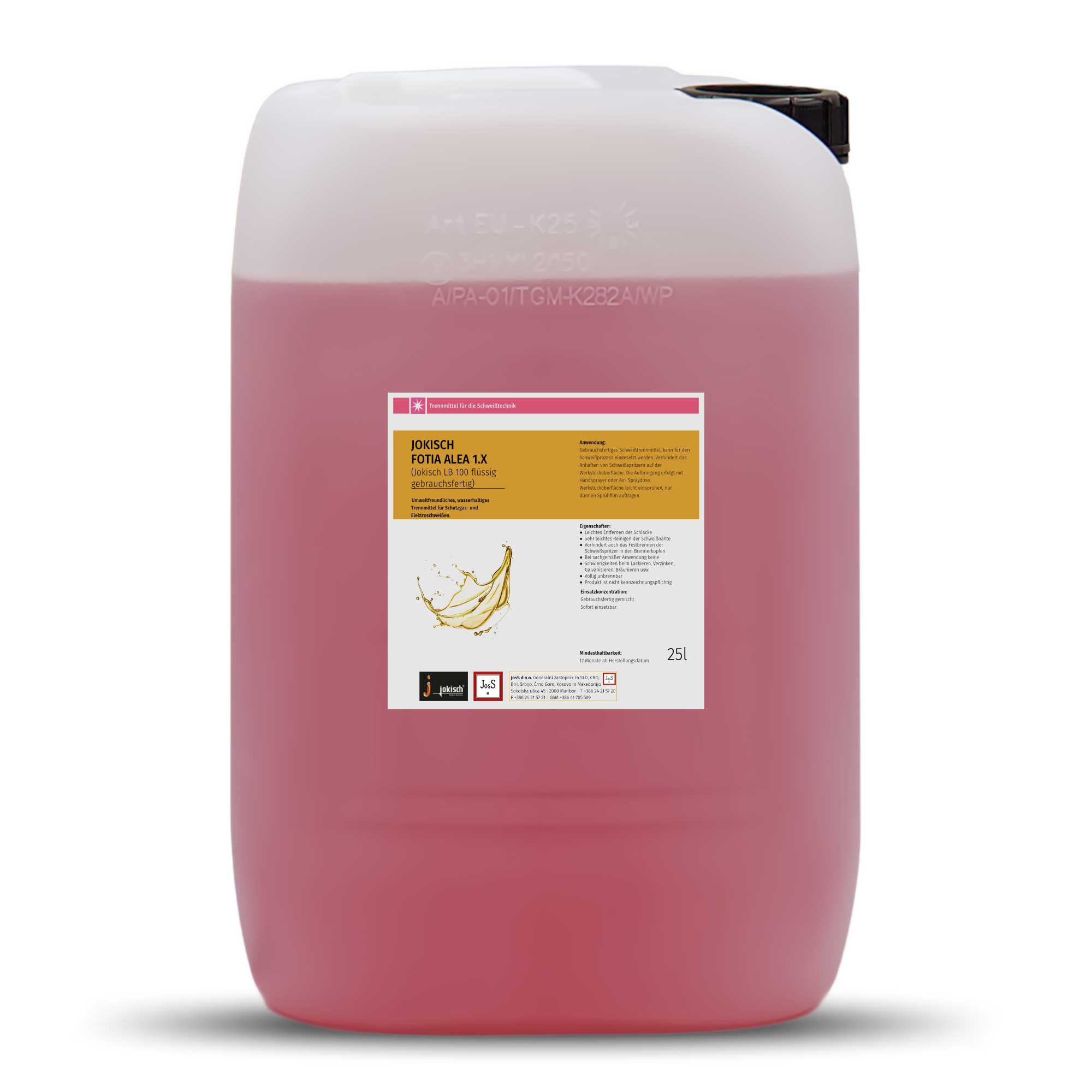 Jokisch Fotia Alea 1.X is a water-based, ready-to-use, environmentally friendly anti-spatter fluid for shielding gas and arc welding. It can be used directly during the welding process without pre-mixing or dilution.