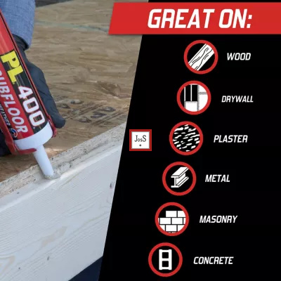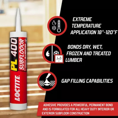 LOCTITE® PL 400 All Weather Subfloor Adhesive is a high-performance, solvent-based adhesive designed to bond subfloor panels to joists and other building components. It performs reliably in both interior and exterior conditions, providing a strong, water-resistant bond that reduces floor squeaks and improves long-term structural integrity.