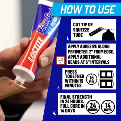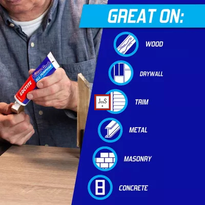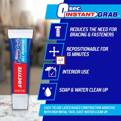 LOCTITE® Power Grab All Purpose Construction Adhesive is designed for general interior construction projects, providing instant tack and strong adhesion on multiple surfaces. It is ideal for paneling, molding, trim, and other installations where a fast, clean bond is required.