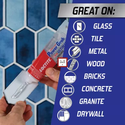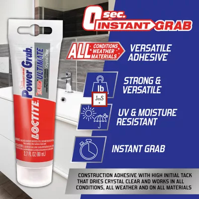LOCTITE® Power Grab Ultimate Crystal Clear is a 100% transparent, all-weather construction adhesive that delivers instant grab and durable bonding for a wide range of materials, indoors or outdoors.