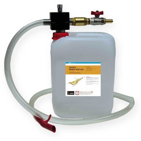 Manual jet-pump mixing unit for preparing homogeneous emulsions – works without electricity, ideal for use with cooling lubricants in all container sizes.